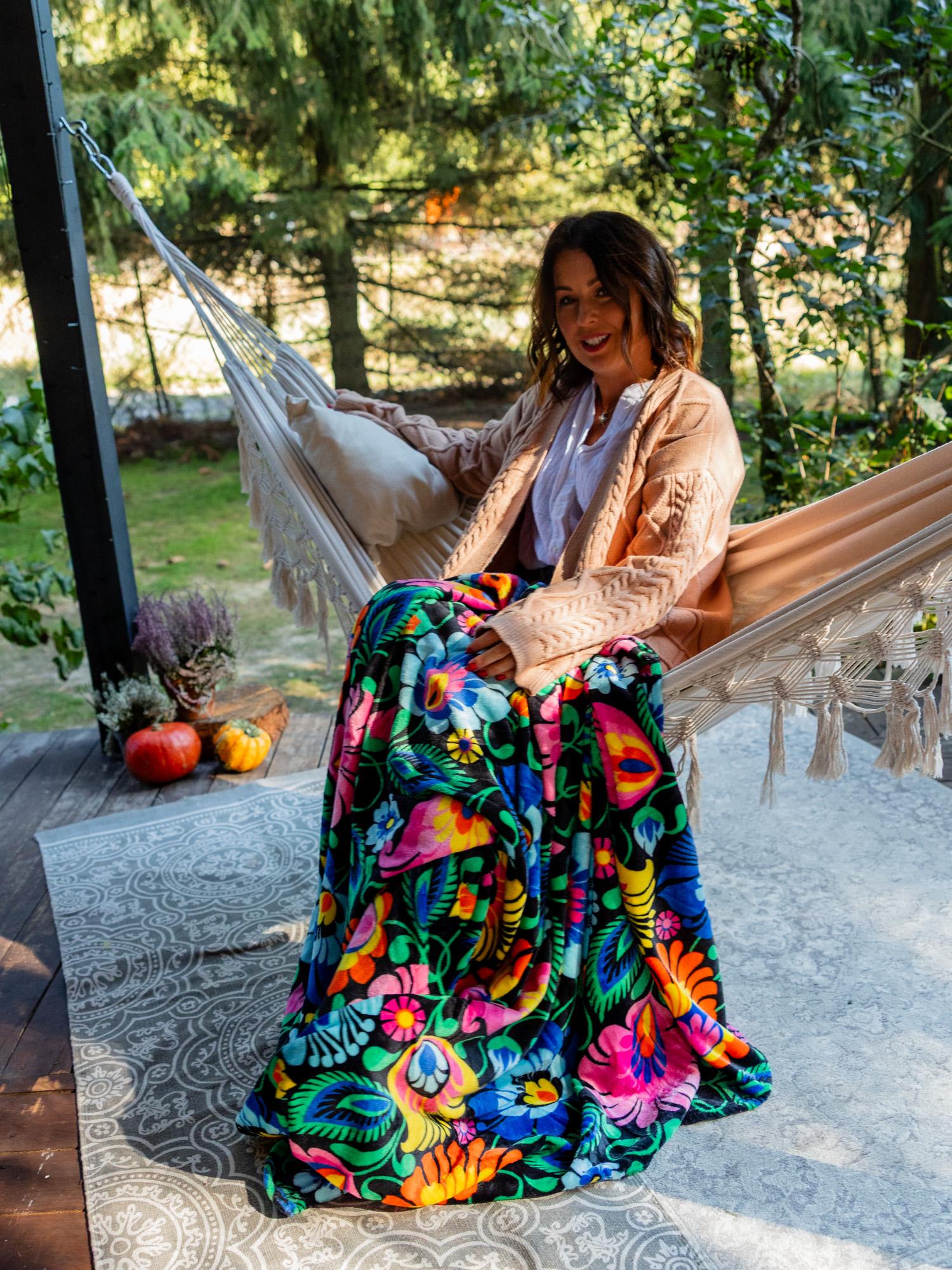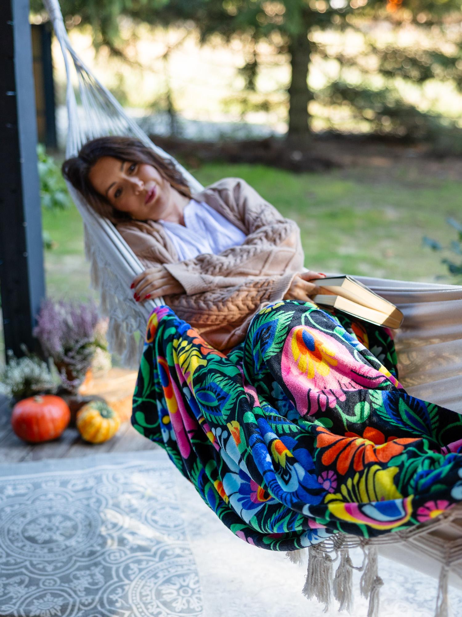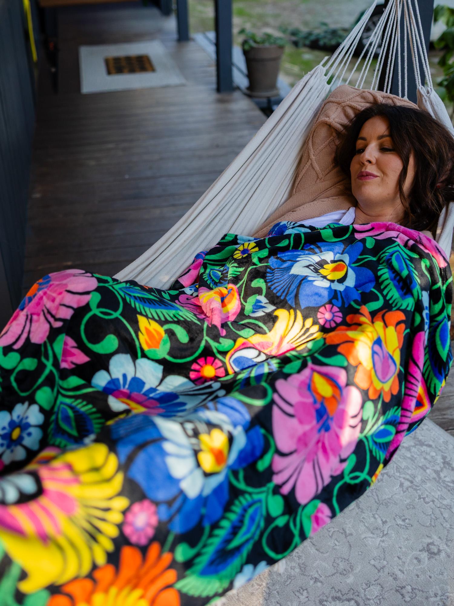 Blanket -black Łowicz pattern is a perfect companion of autumn evenings, winter meetings in front of the fireplace and summer picnics. It will be perfect for any situation and will add some folk colors to it. Because of the beautiful folk pattern from Łowicz, blanket will decorate your home and fit perfectly into any interior. Big, thick and fluffy - it has everything you need. You can not only cover yourself with it, but also wrap it around and warm up properly.