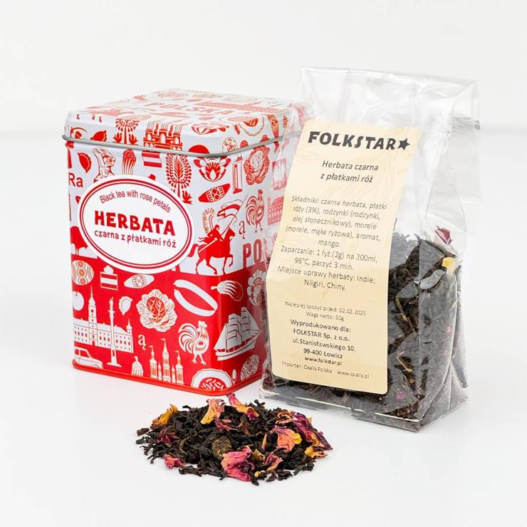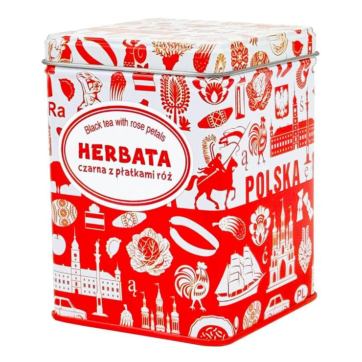 Black tea with rose petals will delight you with its excellent taste and wonderful scent emerging from the cup right after brewing. Packed in a tin, decorated with a white and red pattern with characteristic Polish symbols, it will add charm to your kitchen cabinet :)