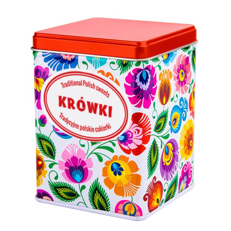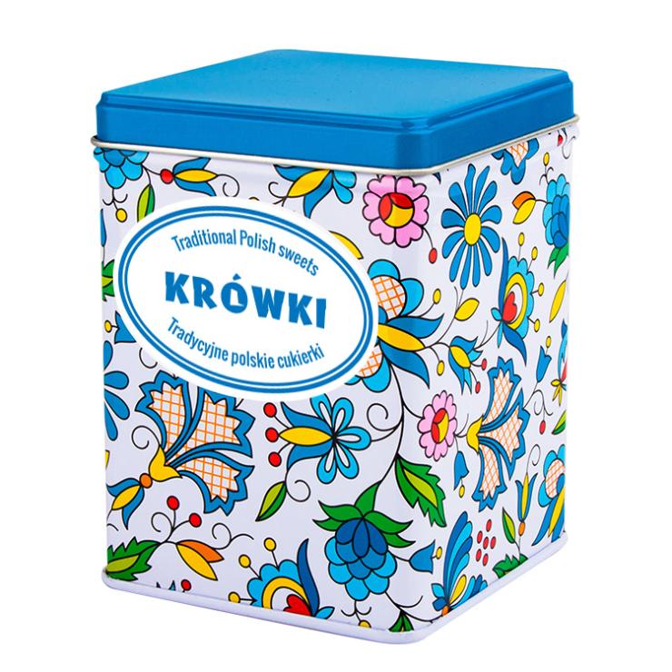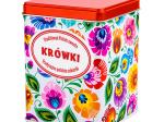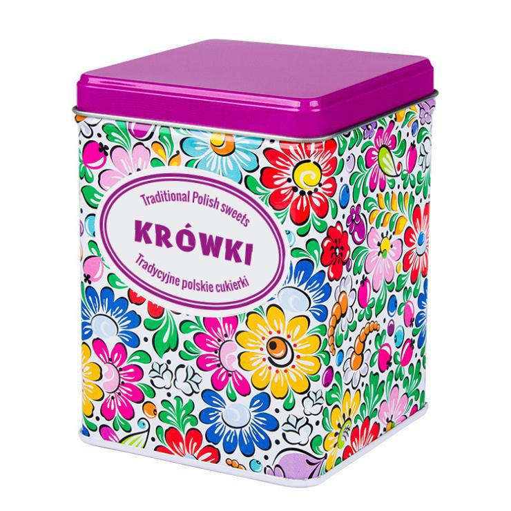 Packed in a metal can decorated with colorful Opole patterns with a purple lid