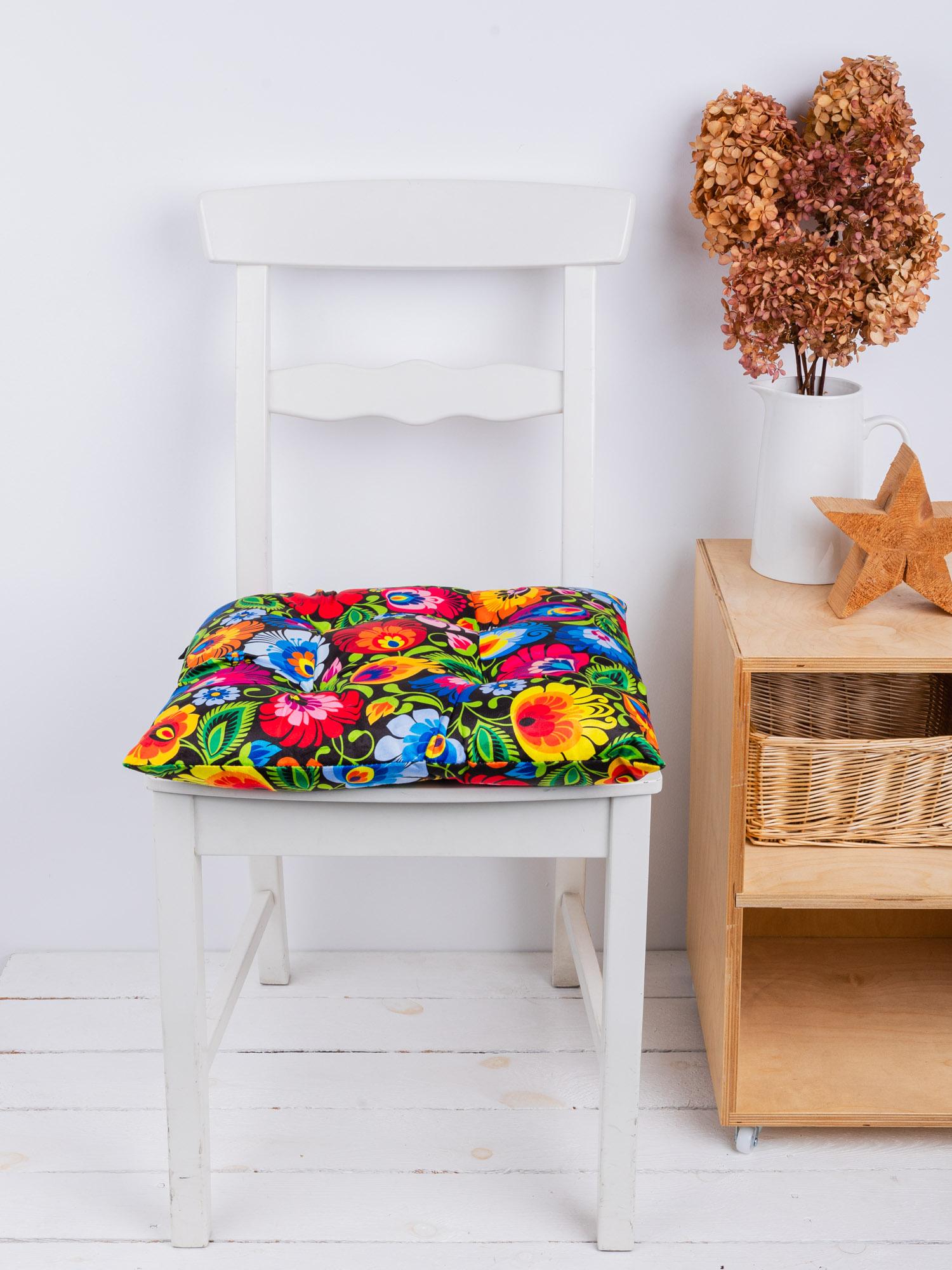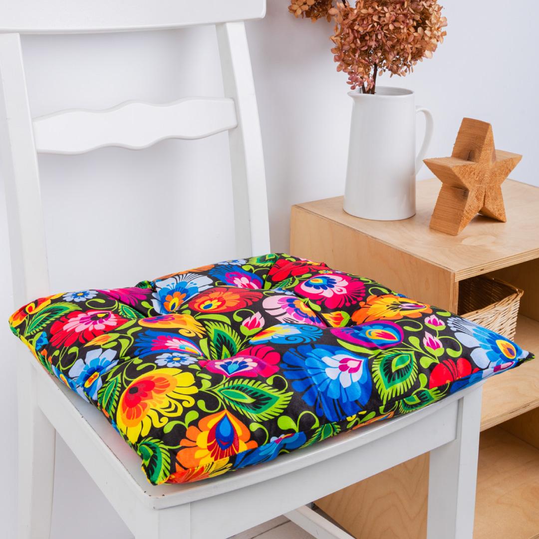 A chair cushion is not only a practical accessory but also a unique interior decoration. Colorful flowers will bring a touch of joy and energy to your home, and the Łowicz pattern will liven up any chair.