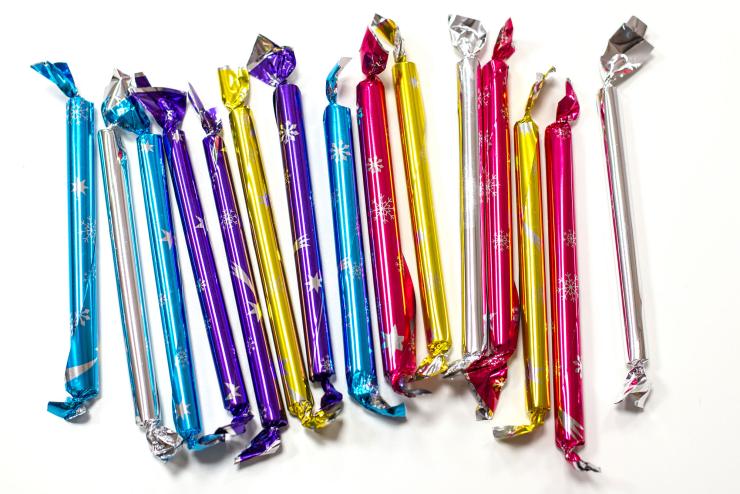 - Candies in colorful wrappers: yellow, green, blue, pink, purple, silver