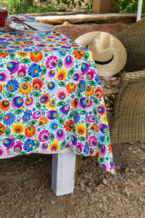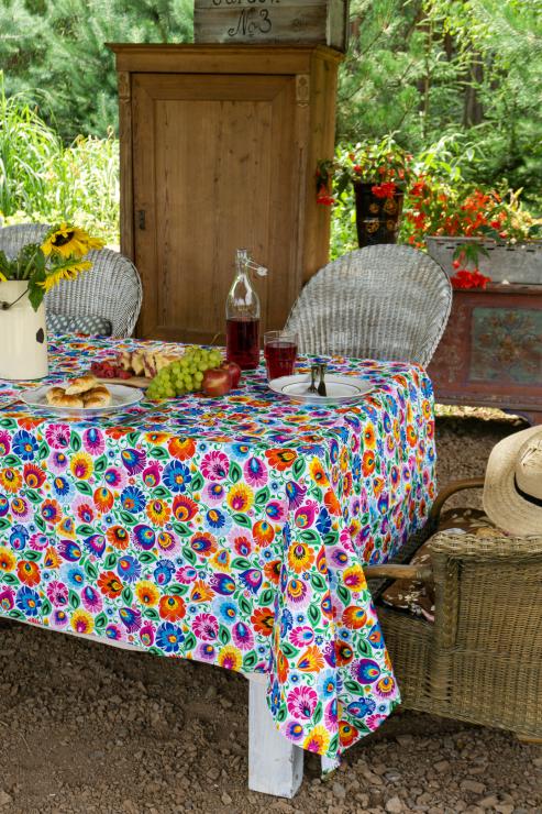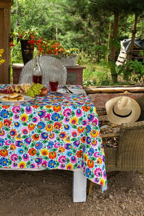 A white cotton tablecloth with white Lowicz pattern is a great way to decorate a table with the most famous folk pattern. It is perfect for family dinners, meetings and celebrations, as well as as a decoration for your living room or dining room. Folk tablecloth delights with an intense range of colors and at the same time protects the table against dirt and scratches.
