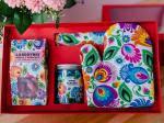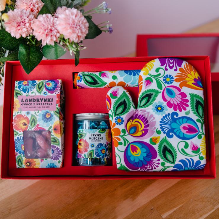 The set includes: a white Łowicz kitchen apron, an oven mitt + a white Łowicz placemat, a white Łowicz kitchen towel, fruit candy, and Milk Iris candy