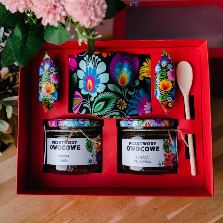 The set includes: 295g strawberry jam, 295g plum jam, black Łowicz kitchen cloth, wooden spoon, 2 pieces of fudge