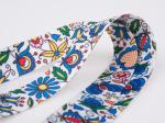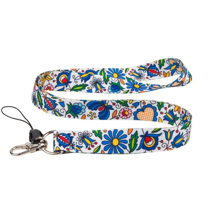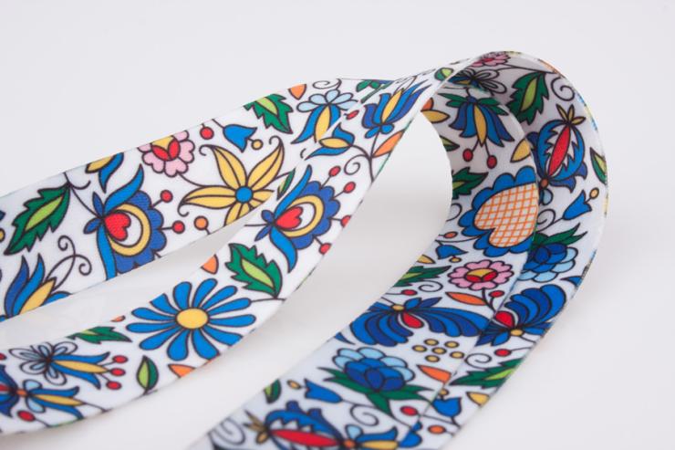 The lanyard is decorated with colorful flowers similar to those found on Kashubian embroidery. The pattern on the lanyard is inspired by the traditional folk pattern from the Kashubian region. The main elements of Kashubian patterns are the motifs of pansies, lilies, forget-me-nots, bells, carnations, cornflowers, clovers and roses taken from the surrounding nature, but there are also flowers taken from abroad. There are many Kashubian embroidery schools, elements of which can be found in products designed by Folkstar.