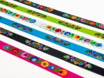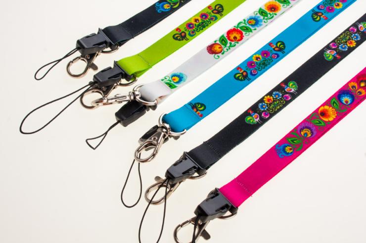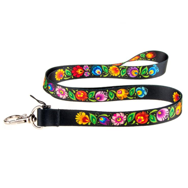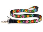 Lanyard for keys with folk patterns from Lowicz. Folk lanyard is decorated with colorful flowers from the Łowicz cutout on a black background. The pattern on the lanyard is inspired by the traditional folk pattern from the Łowicz region. The leading elements of the cut-outs from Łowicz are roosters, peacocks and floral motifs.