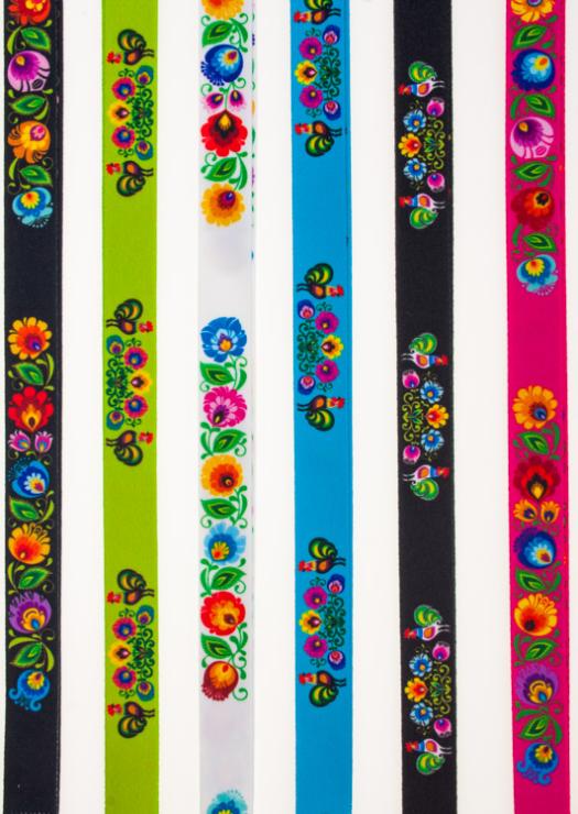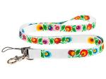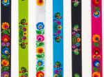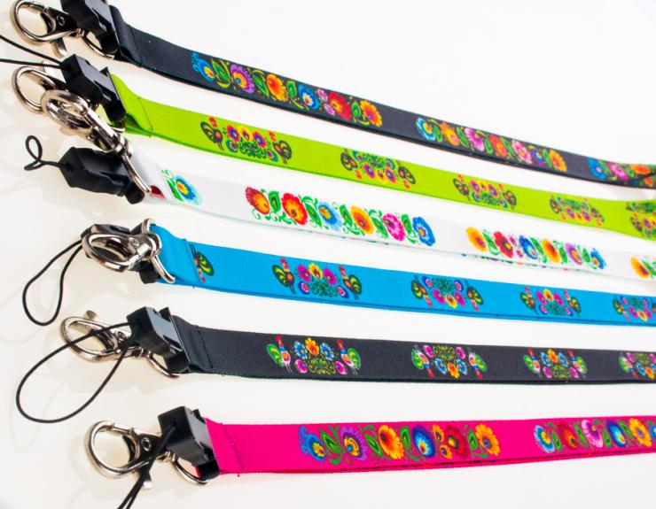Lanyard for keys with folk patterns from Lowicz. Folk lanyard is decorated with colorful flowers from the Łowicz cutout on a black background. The pattern on the lanyard is inspired by the traditional folk pattern from the Łowicz region. The leading elements of the cut-outs from Łowicz are roosters, peacocks and floral motifs.