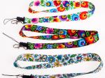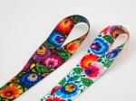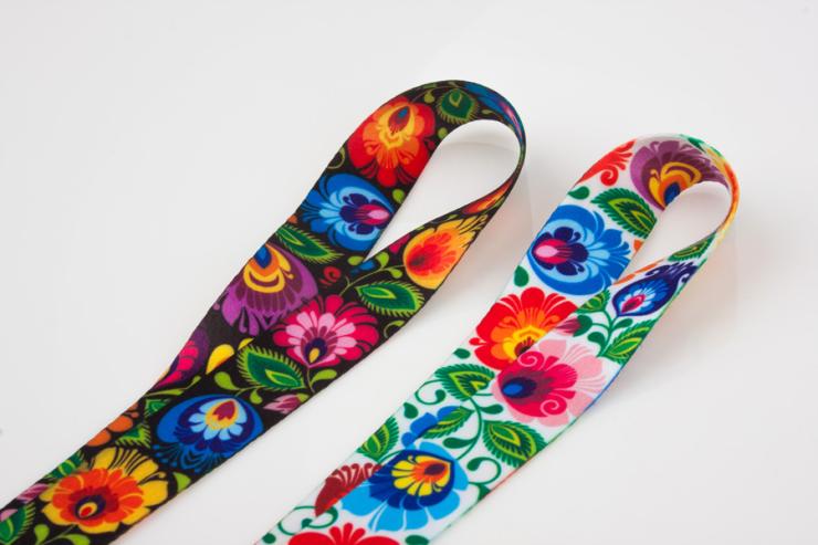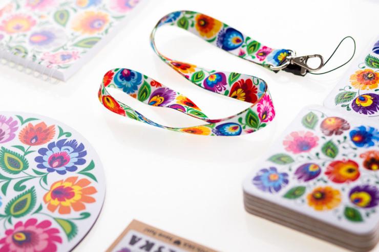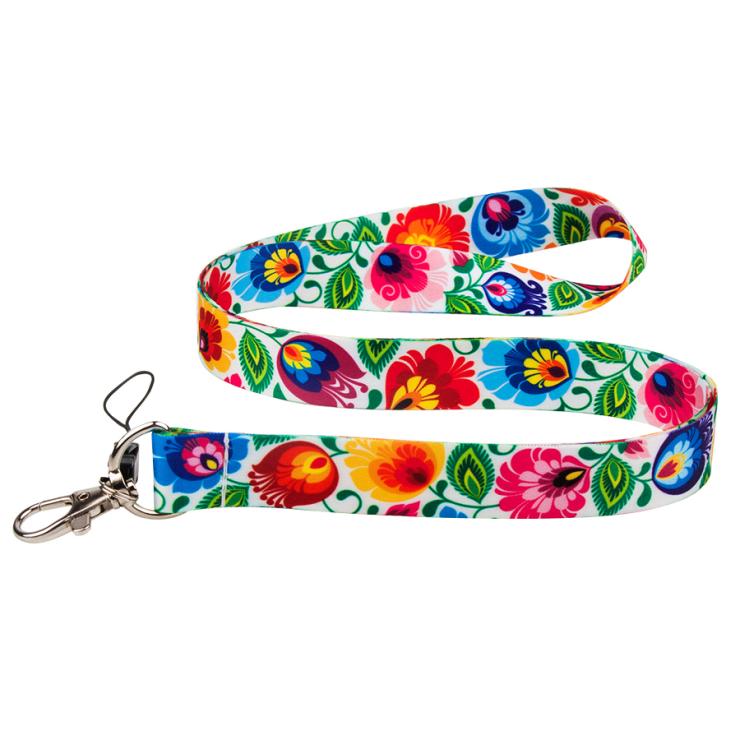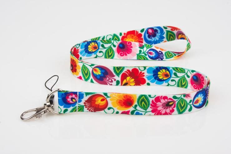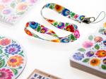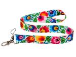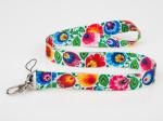 Lanyard for keys with folk patterns from Lowicz. Folk lanyard is decorated with colorful flowers from the Łowicz cutout on a white background. The pattern on the lanyard is inspired by the traditional folk pattern from the Łowicz region. The leading elements of the cut-outs from Łowicz are roosters, peacocks and floral motifs.