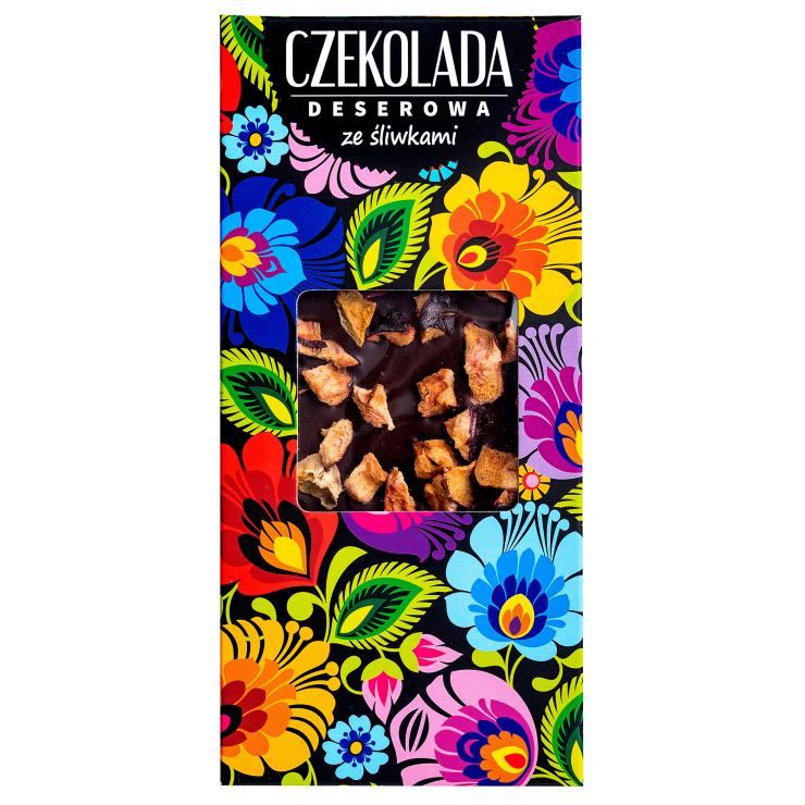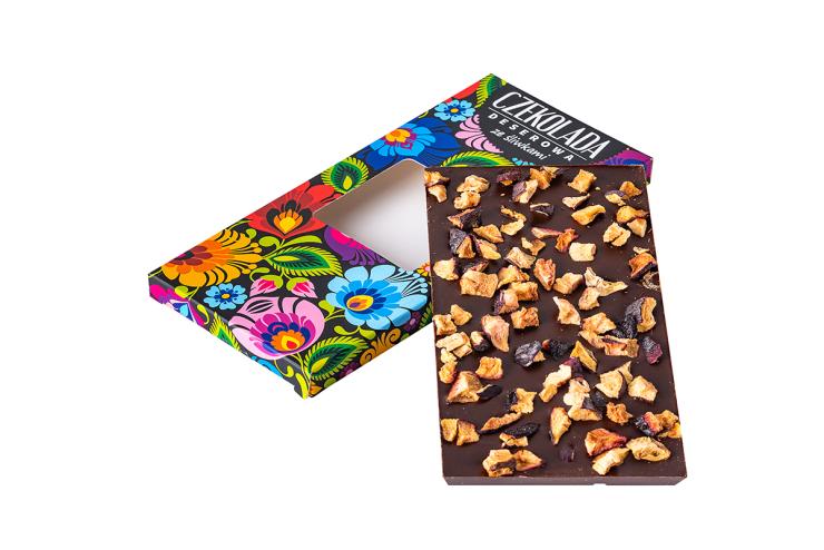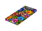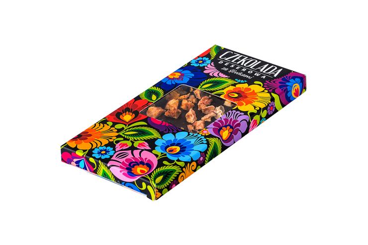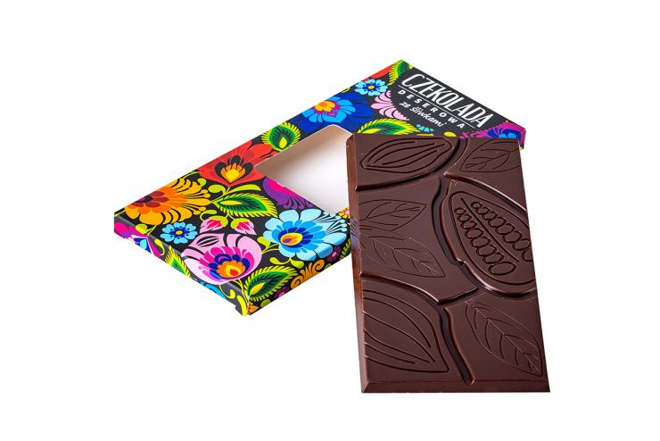 The chocolate is in decorative packaging with a Lowicz pattern on a black background. The motif decorating folk chocolate is inspired by traditional cut-outs from Lowicz - the most recognizable symbol of Polish folklore.