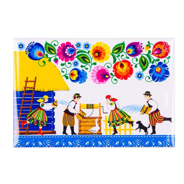 Magnet - inhabitants of the Łowicz village dressed in folk costumes from Łowicz with a motif of Łowicz flowers, characteristic of traditional cut-outs from Łowicz - kodra.