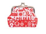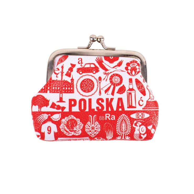 Polish symbols that can be found on the purse: Lajkonik, Sausage, Royal Castle in Warsaw, Cracow Nativity Scene, Faworki, Dumplings, Oscypek, Cabbage for bigos, Car "Maluch", Cake "Wuzetka", Stork, Polish vodka, Tomato soup, Masovian Willow, Husaria, Polish zloty