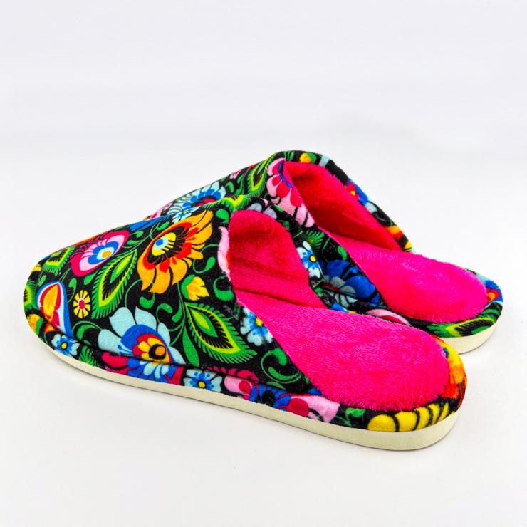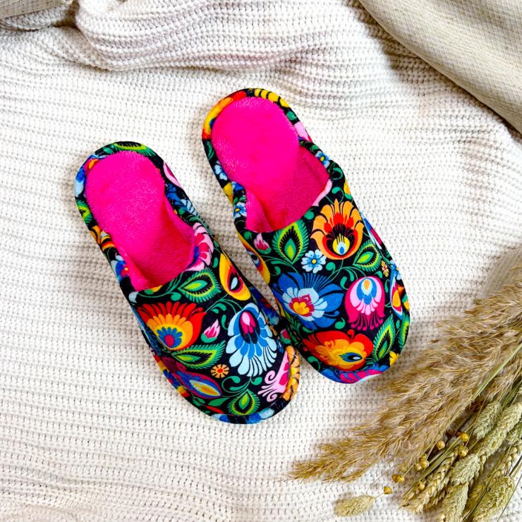 Women's home slippers - black Lowicz pattern are soft and pleasant to the touch, they are the perfect slippers for autumn and winter evenings. Thanks to the soft sole, they are very comfortable to wear ;)