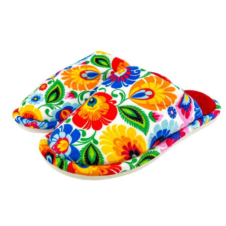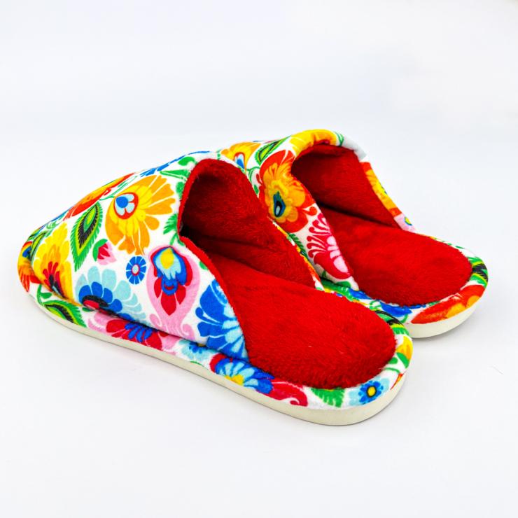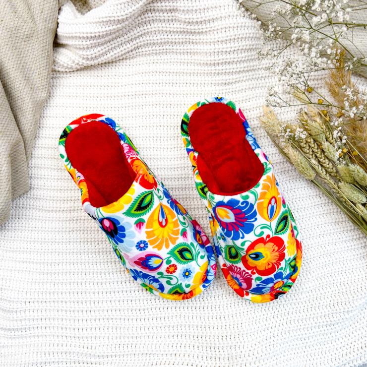 Women's slippers - white Lowicz pattern are soft and pleasant to the touch, they are the perfect slippers for autumn and winter evenings. Thanks to the soft sole, they are very comfortable to wear ;)