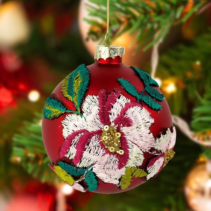 Bombka Haft matowa - czerwona w różowe kwiaty