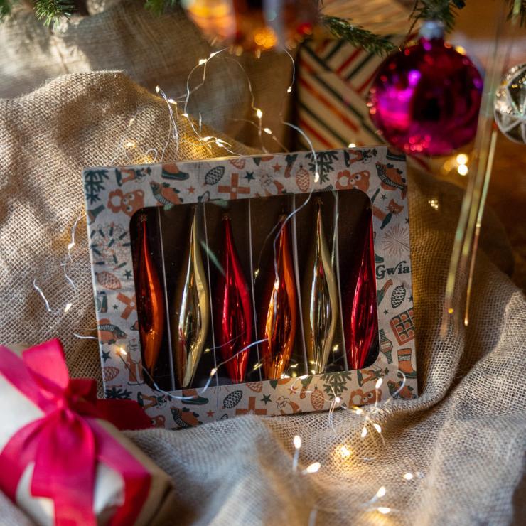 Bombki retro sople czerwony-złoty-pomarańcz - komplet 6 sztuk