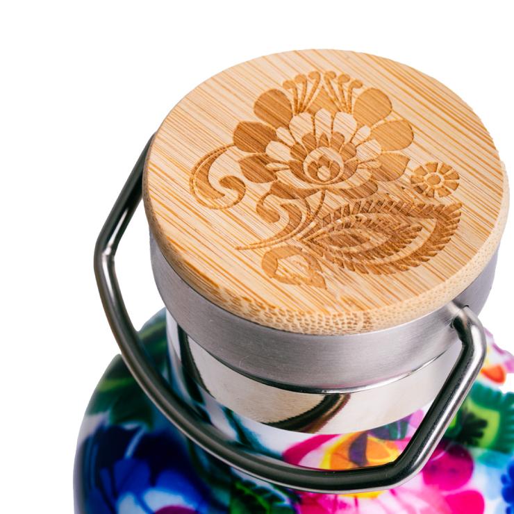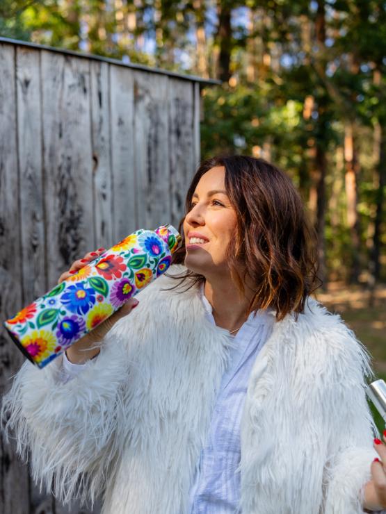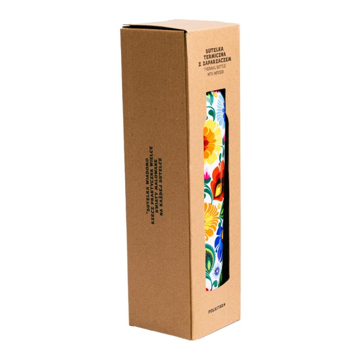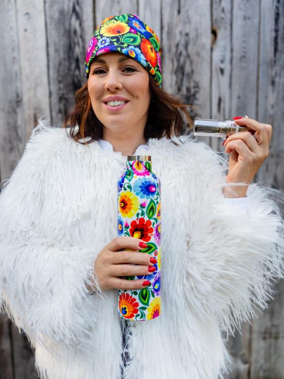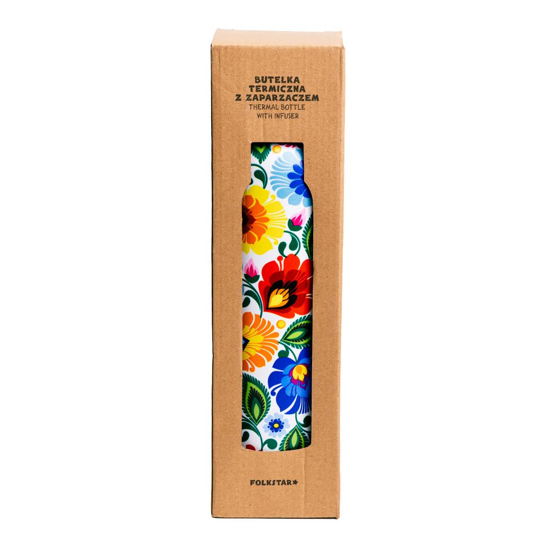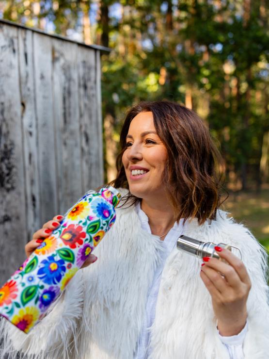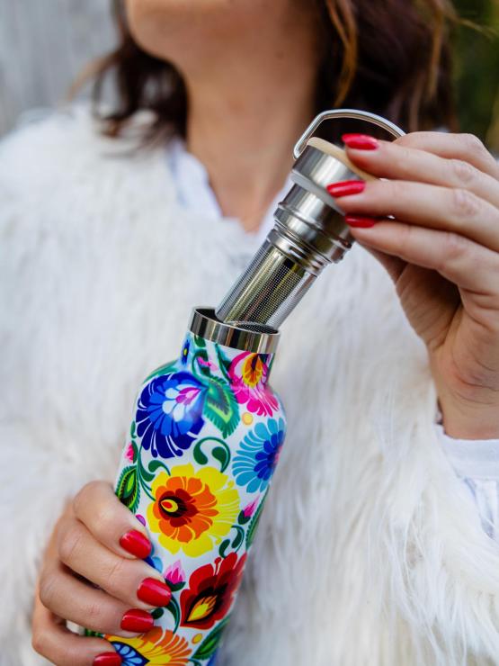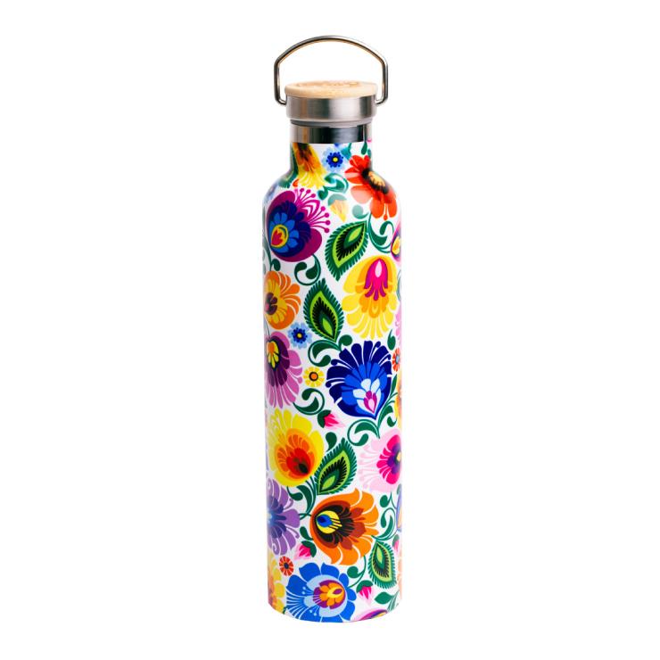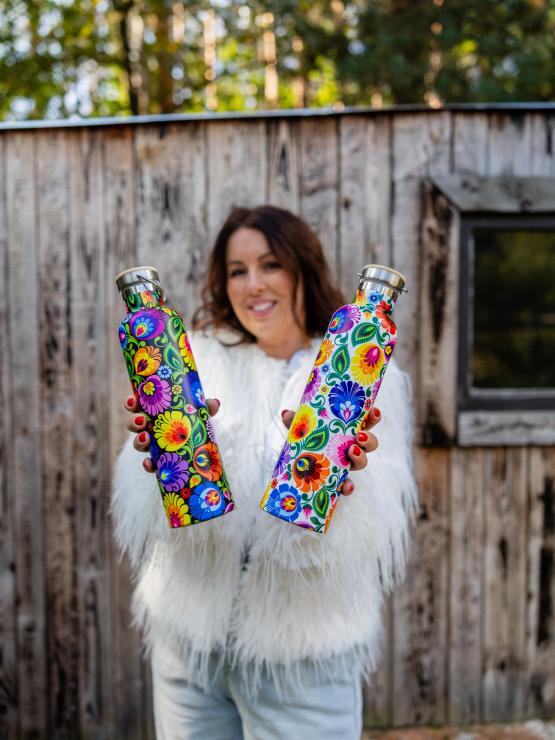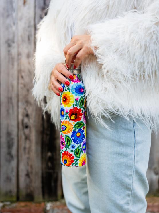 Łowicka butelka termiczna to ładna, zgrabna, w kwiatki, użyteczna butelka, która jest idealna zarówno na co dzień - na kawkę do pracy, jak i na krótsze i dłuższe wyjazdy, spacery po lesie czy górskie wędrówki. Utrzymuje temperaturę zarówno zimnych napoi, jak i wrzątku.