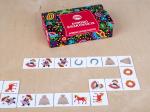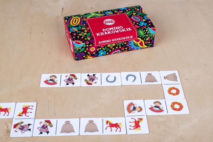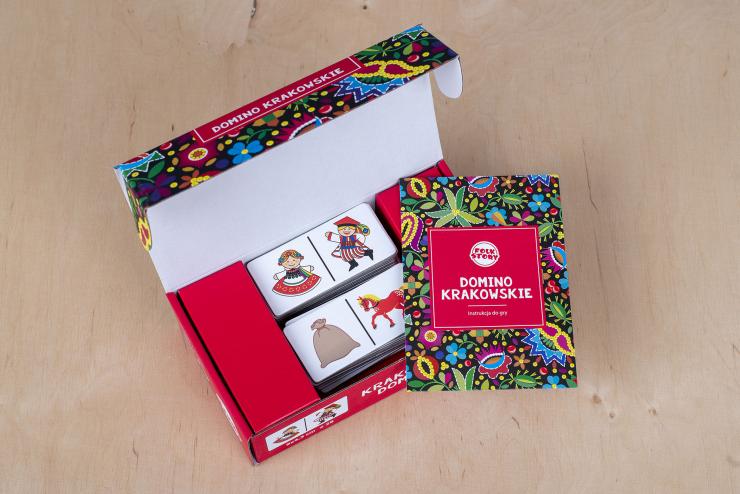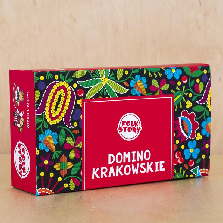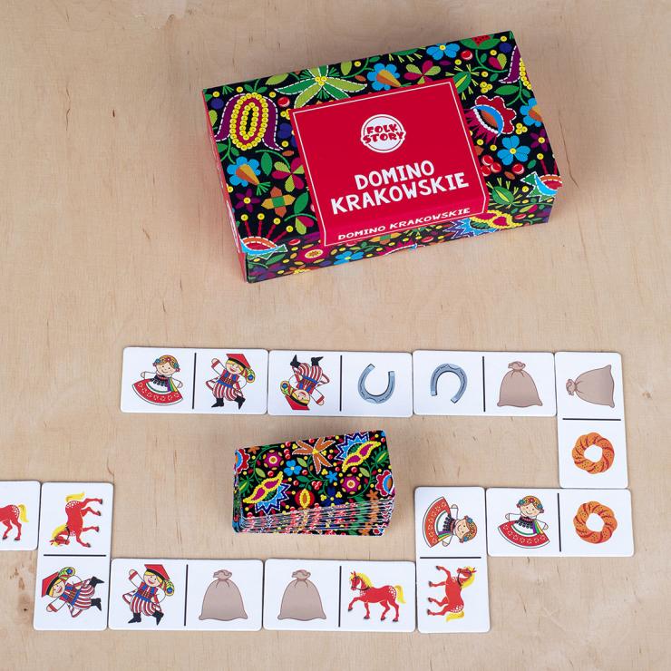 Domino krakowskie z serii FolkStrory wykorzystuje elementy znane z krakowskiego folkloru i przenosi je na jedną z najsłynniejszych gier edukacyjnych na świecie. Korale, obwarzanek i podkowa to tylko niektóre z nich. Jadzia i Kazio gospodarujący w malowniczej krakowskiej wiosce zapraszają na ławeczkę przed swoją chałupę, na pratyjkę w krakowskie domino. Kafelki domina, kolorowe niczym odpustowe stragany, to sposób na świetną zabawę i łatwą naukę symboli związanych z Krakowem i jego folklorem.