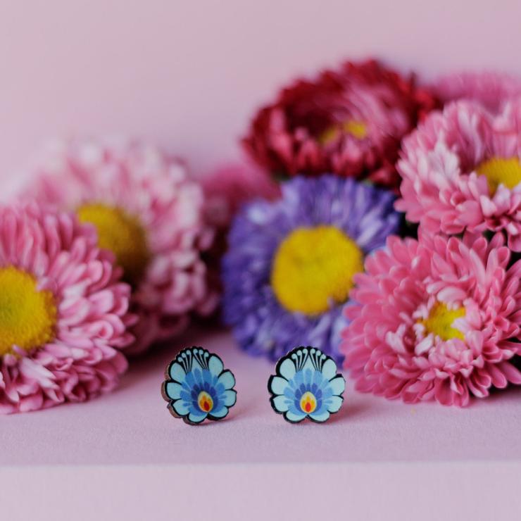 Kolczyki drewniane wkręty - niebieskie kwiaty łowickie: