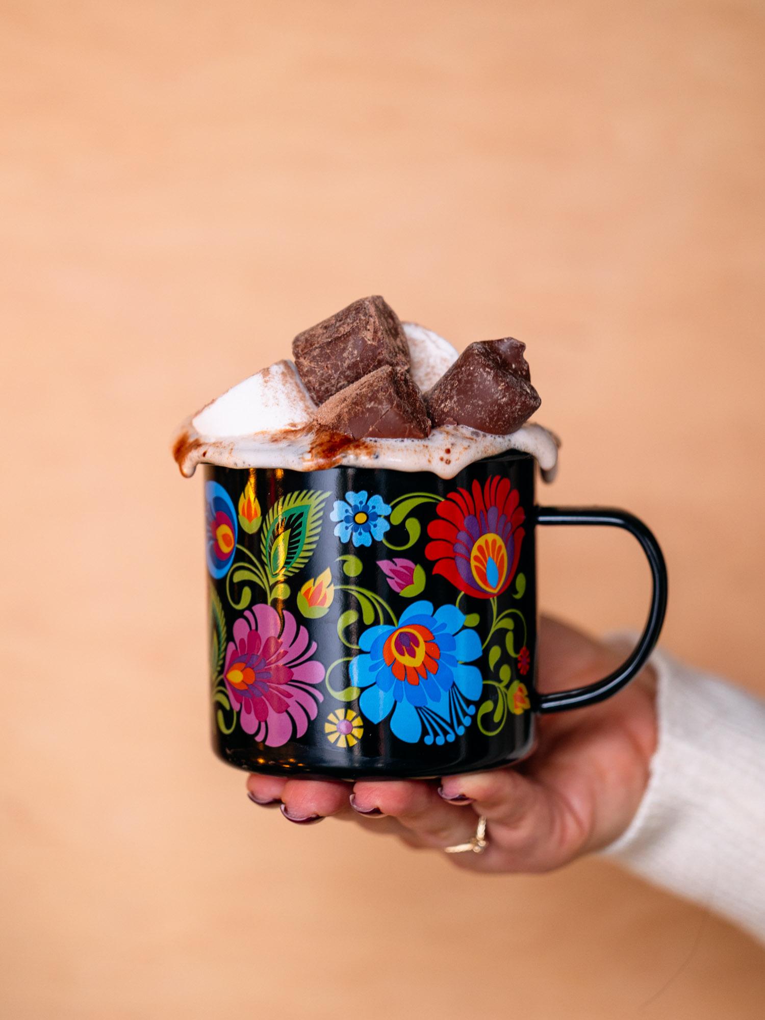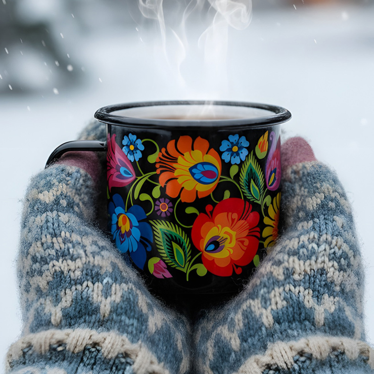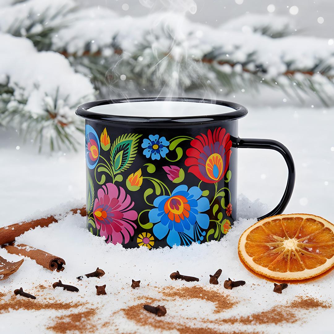 Kubek emaliowany Janek - łowicki czarny to rodzaj kubka, który każdy zna. To kubek, z którego piło się kakao po powrocie z podwórka, herbata parowała w nim podczas długich zim, a latem wypełniał się kompotem z owoców prosto z sadu.