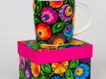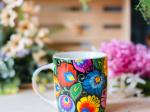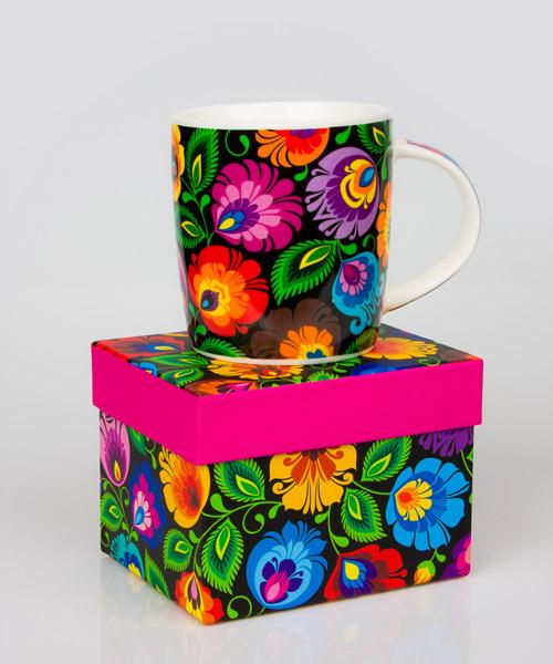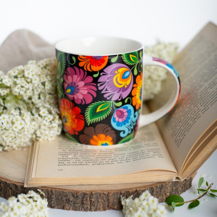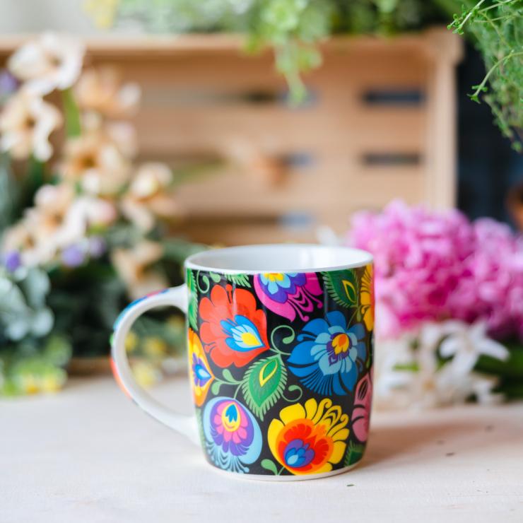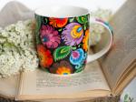 Czarny kubek w kolorowe, łowickie wycinanki pozwala rozkoszować się smakiem ulubionej herbaty i gładko wejść w każdy poniedziałek oraz stawić czoła wszelkim wyzwaniom. Kwiecista kompozycja, która zaparła Ci w piersiach dech, to autorski pomysł naszego nadwornego projektanta. Do stworzenia tego wzoru zainspirował nas dorobek Księstwa Łowickiego.