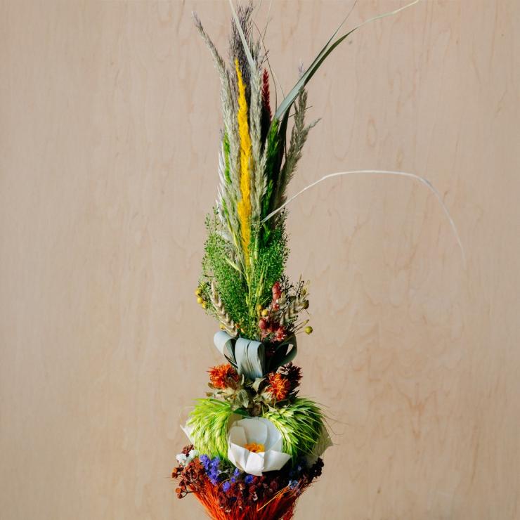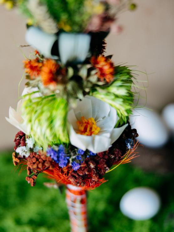 Wykonane z kwiatów z bibuły, szuszonych traw, trzcin i zboża