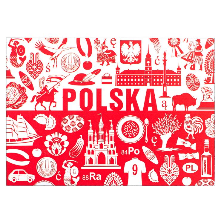 Polskie symbole, które znajdują się na pocztówce: Lajkonik, Kiełbasa, Zamek królewski w Warszawie, Szopka krakowska, Faworki, Pierogi, Oscypek, Kapusta na bigos, Maluch, Wuzetka, Bocian, Polska wódka, Pomidorowa, Wierzba mazowiecka, Husaria, Złotówka