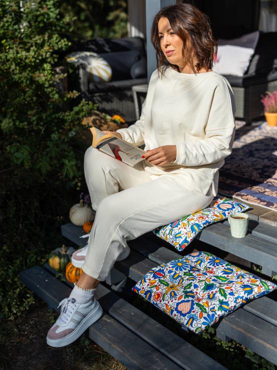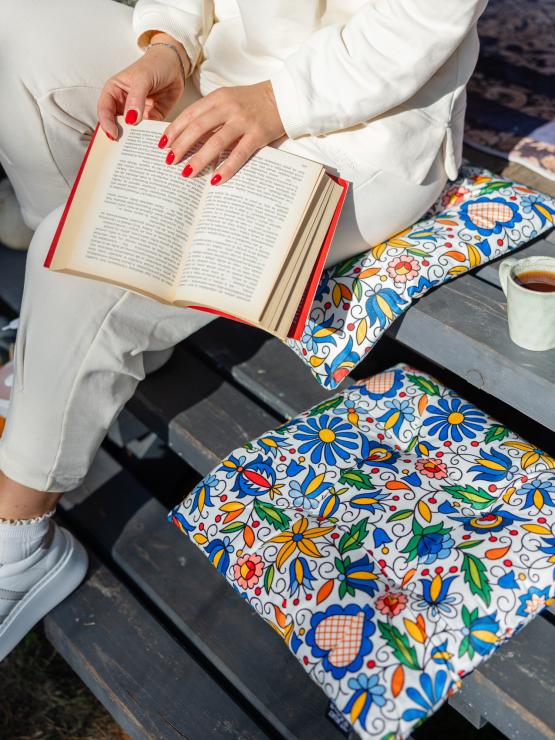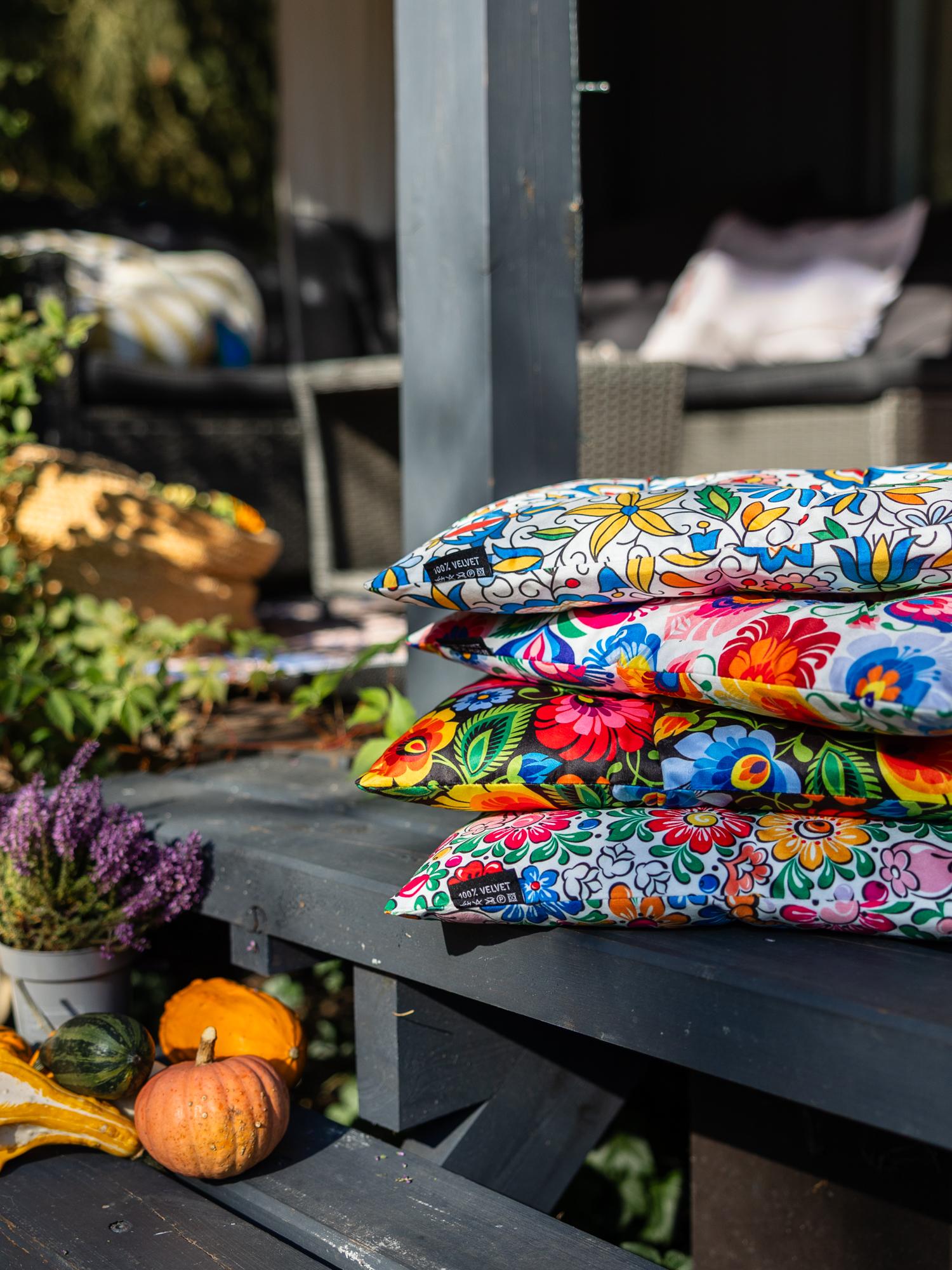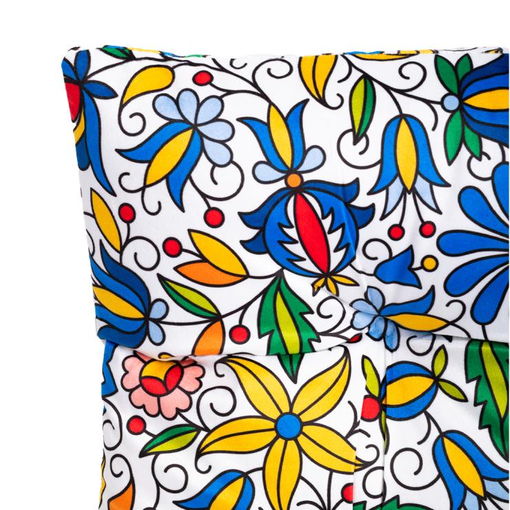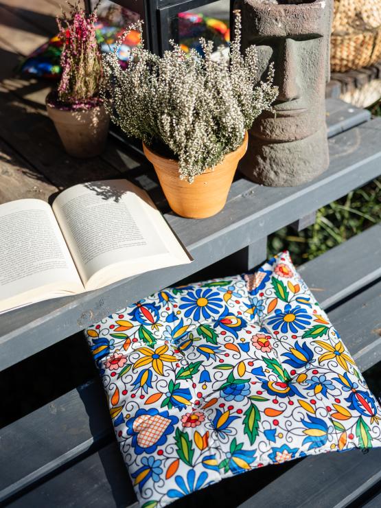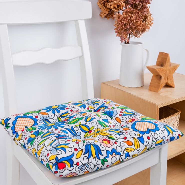 Poduszka na krzesło to nie tylko praktyczny dodatek, ale też wyjątkowa dekoracja wnętrza. Kolorowe kwiaty wniosą do Twojego domu odrobinę radości i energii, a wzór kaszubski ożywi każde krzesło.