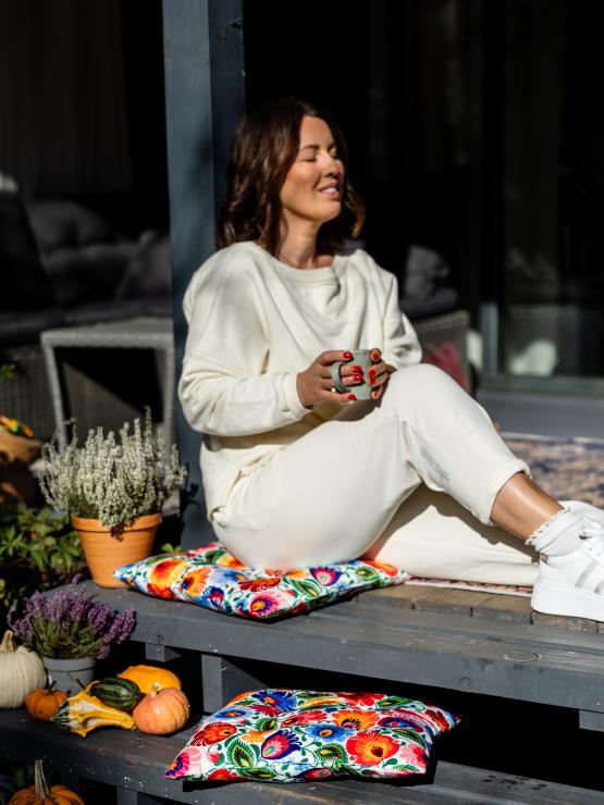 Nasza poduszka na krzesło - łowicka biała to połączenie wzorów ludowych, wygody i funkcjonalności. Dzięki niej nawet zwykłe krzesło stanie się stylowym i miękkim miejscem do siedzenia.