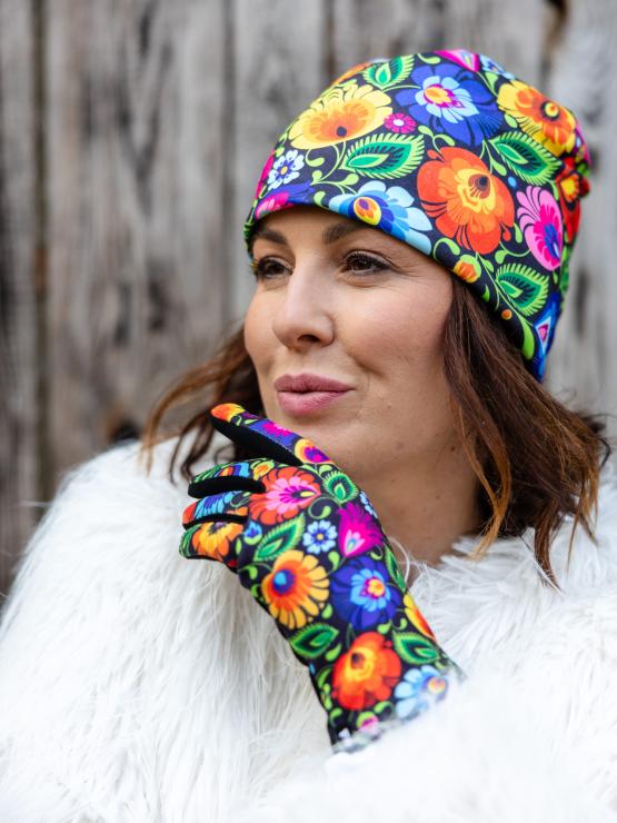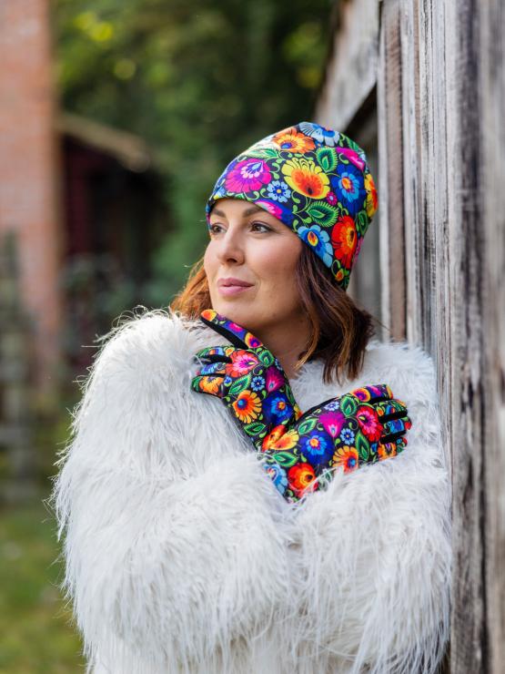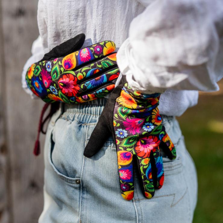 Rękawiczki damskie w kwiaty łowickie to połączenie folkloru z nowoczesnym stylem. Miękka, ciepła tkanina otula dłonie niczym delikatna chmurka. Rękawiczki - łowickie czarne to Twój znak rozpoznawczy, który mówi: „Mam styl, charakter i nutkę szaleństwa!”. Idealne na codzienne spacery, miejskie wyjścia i każdą okazję, kiedy chcesz pokazać, że folklor może być modny.