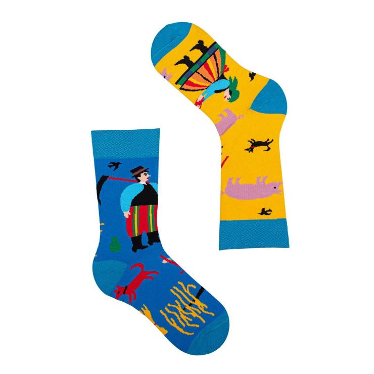 Wzór inspirowany czasem zbiorów – pełen ciepłych barw, zbożowych motywów i ludowej lekkości. Do noszenia boso (z przymrużeniem oka), pod kalosze, do sandałów z charakterem albo po prostu na domowy chill z kompotem z wiśni w ręku.