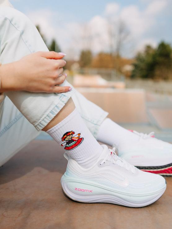 Skarpetki długie białe z folkową ikonką Krakowianki na górze to idealny dodatek, który przełamie każdą stylizację - od jeansów, przez sukienki, po modne snickersy. Delikatny wzór dodaje im unikatowego charakteru, dzięki czemu sprytnie łączą modę z tradycją.