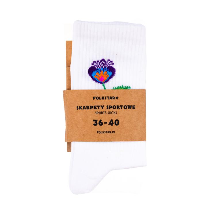 Skarpetki długie białe - Kwiatek łowicki fioletowy