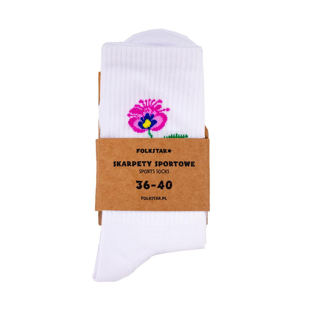 Skarpetki długie białe - Kwiatek łowicki różowy