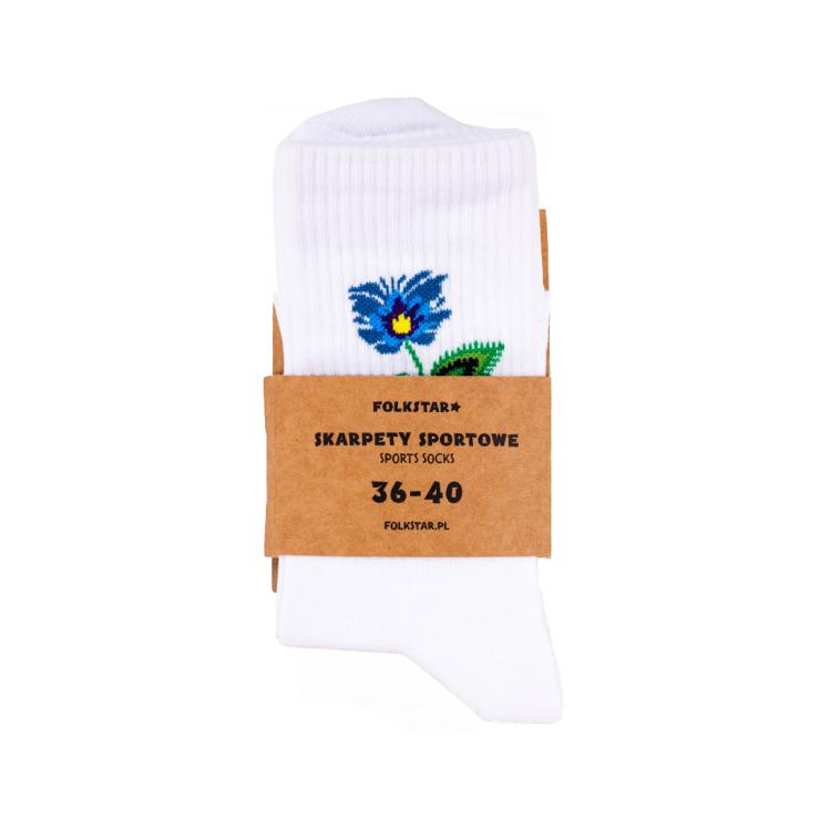 Skarpetki długie białe - Kwiatek niebieski łowicki: