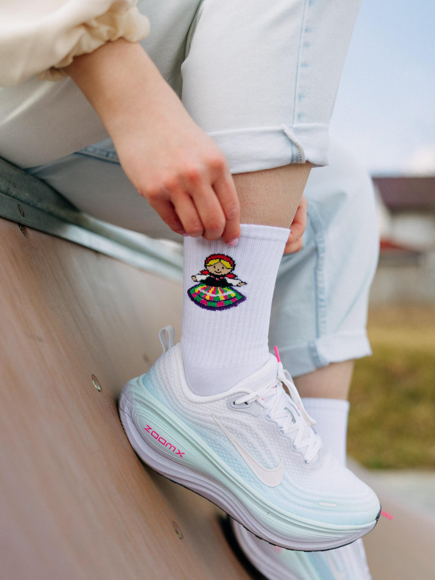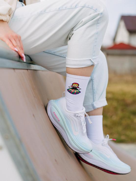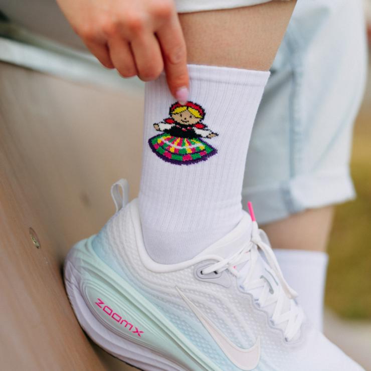 Skarpetki długie białe z folkową ikonką Łowiczanki na górze to idealny dodatek, który przełamie każdą stylizację - od jeansów, przez sukienki, po modne snickersy. Delikatny wzór dodaje im unikatowego charakteru, dzięki czemu sprytnie łączą modę z tradycją.