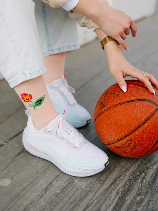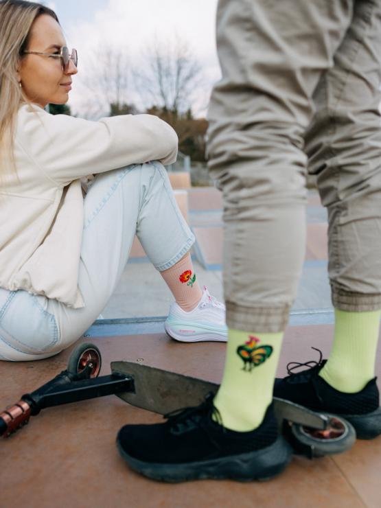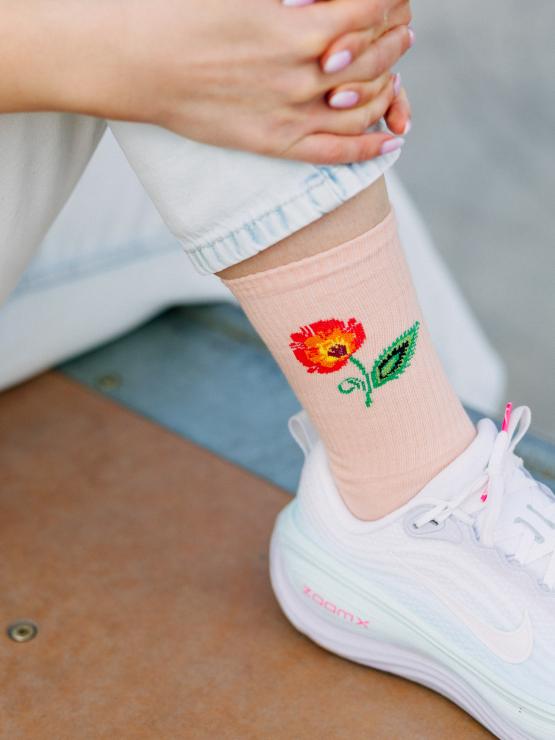 Skarpetki długie pomarańczowe z folkową ikonką Kwiatka łowickiego na górze to idealny dodatek, który przełamie każdą stylizację - od jeansów, przez sukienki, po modne snickersy. Delikatny wzór dodaje im unikatowego charakteru, dzięki czemu sprytnie łączą modę z tradycją.