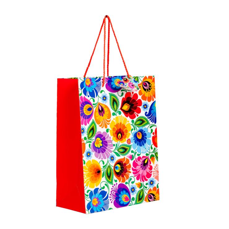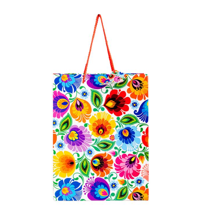 Torebka ozdobna do pakowania prezentów – wzór kwiatów z tradycyjnej wycinanki łowickiej
