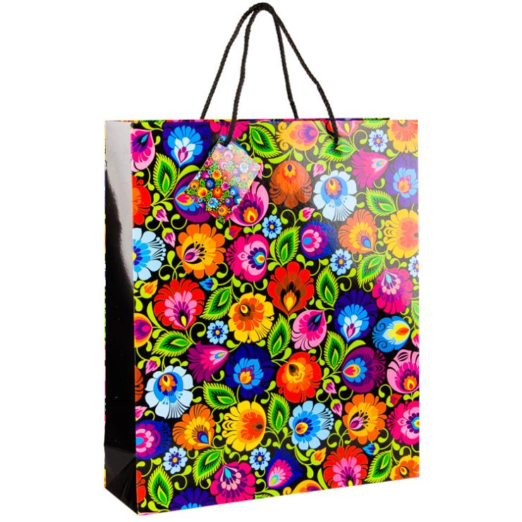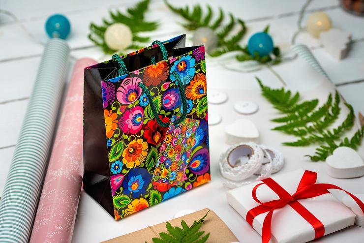 Torebka ozdobna do pakowania prezentów – wzór kwiatów z tradycyjnej wycinanki łowickiej:
