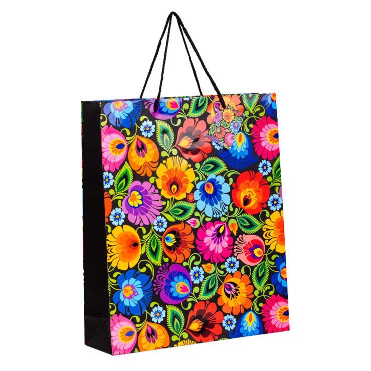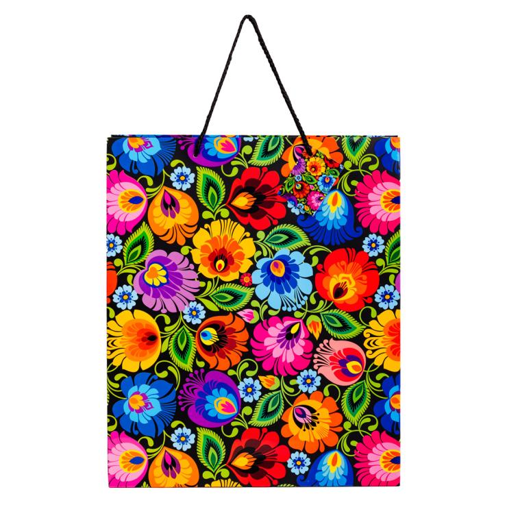 Torebka ozdobna do pakowania prezentów – wzór kwiatów z tradycyjnej wycinanki łowickiej: